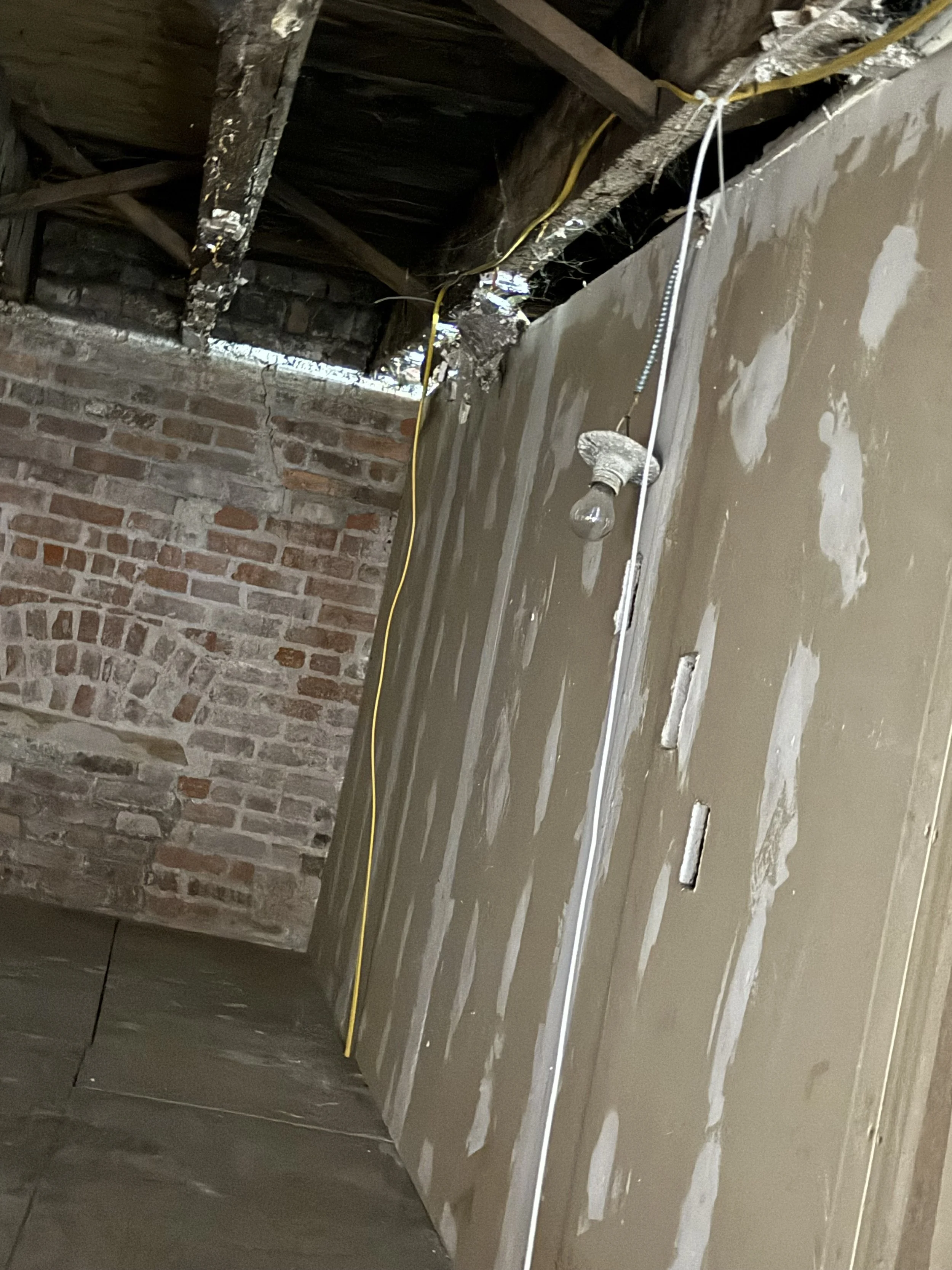 11. In the attic, replace this non-working, dangling bulb with a working simple light socket attached to the wall or ceiling.